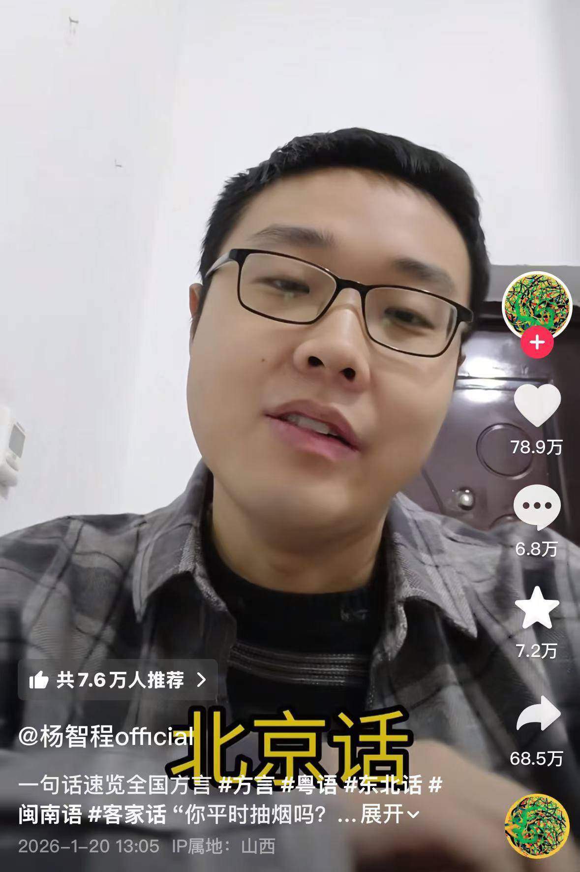 视频中,杨先生依次用了101种方言说出“你平时抽烟吗?我不抽烟”这句话,涵盖东北话、闽南语、客家话、粤语等各地代表性方言。短短两天,视频点赞量已接近80万,转发量也超过60万。